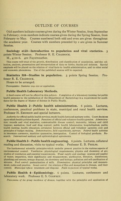 In 1930, courses in Public Health Engineering reflect the practice of “environmental control” such as ventilation, water supply and sewerage, food safety, pest control, municipal refuse, etc. The program in Public Health Administration covered sanitation and hygiene.