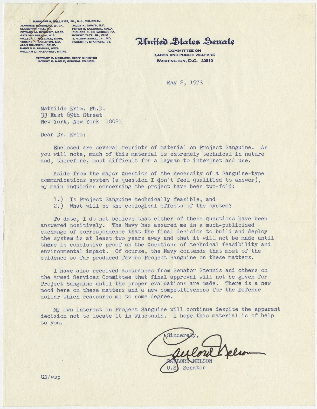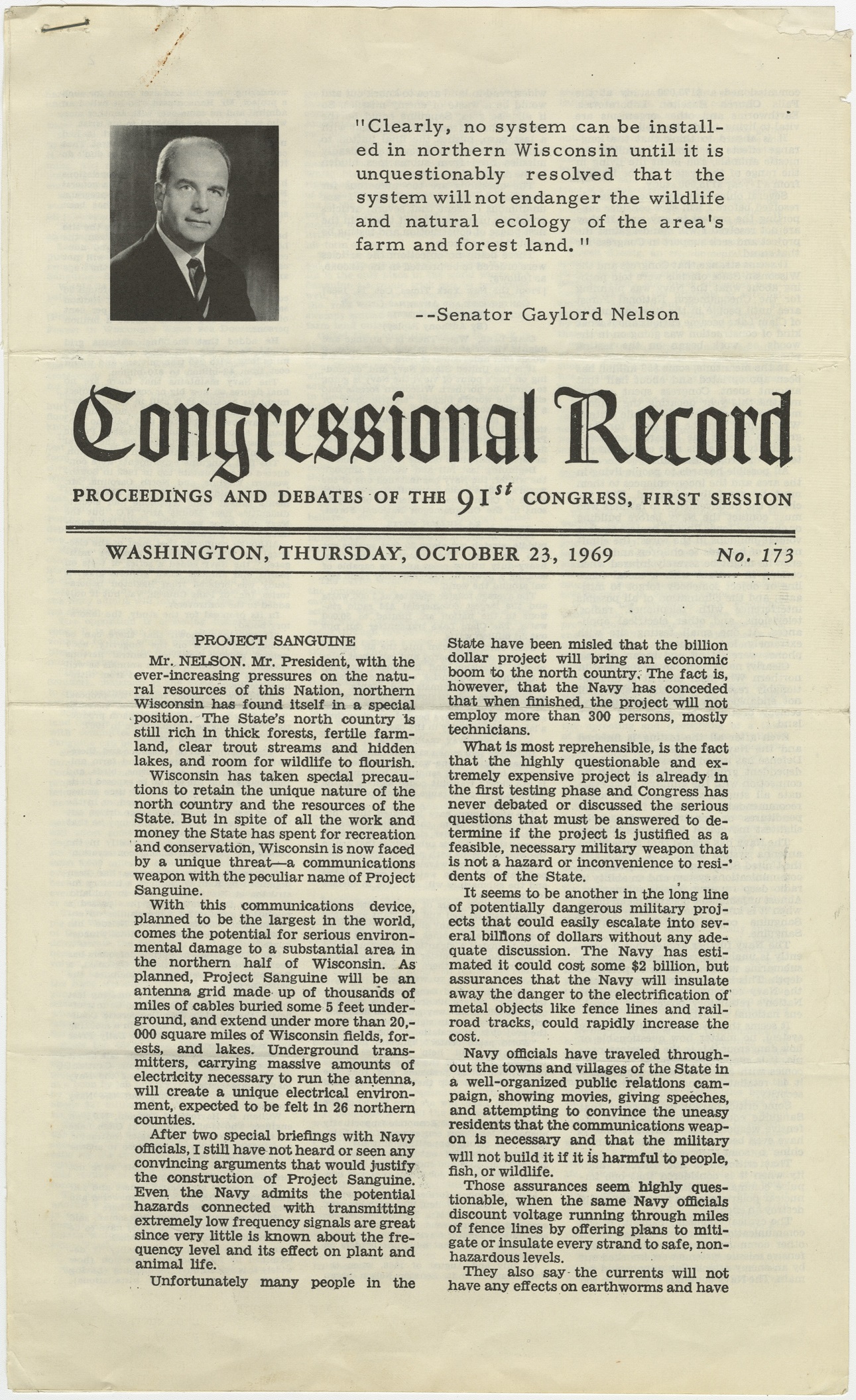 As evident in the October 23, 1969 Congressional Record, Senator Gaylord Nelson was opposed to project in his home state of Wisconsin, citing environmental concerns. This document, along with letters and newspaper clippings, were collected by scientist Mathilde Krim. Krim owned property at a proposed antenna site in Llano County, Texas and also opposed the project, which never found fruition.