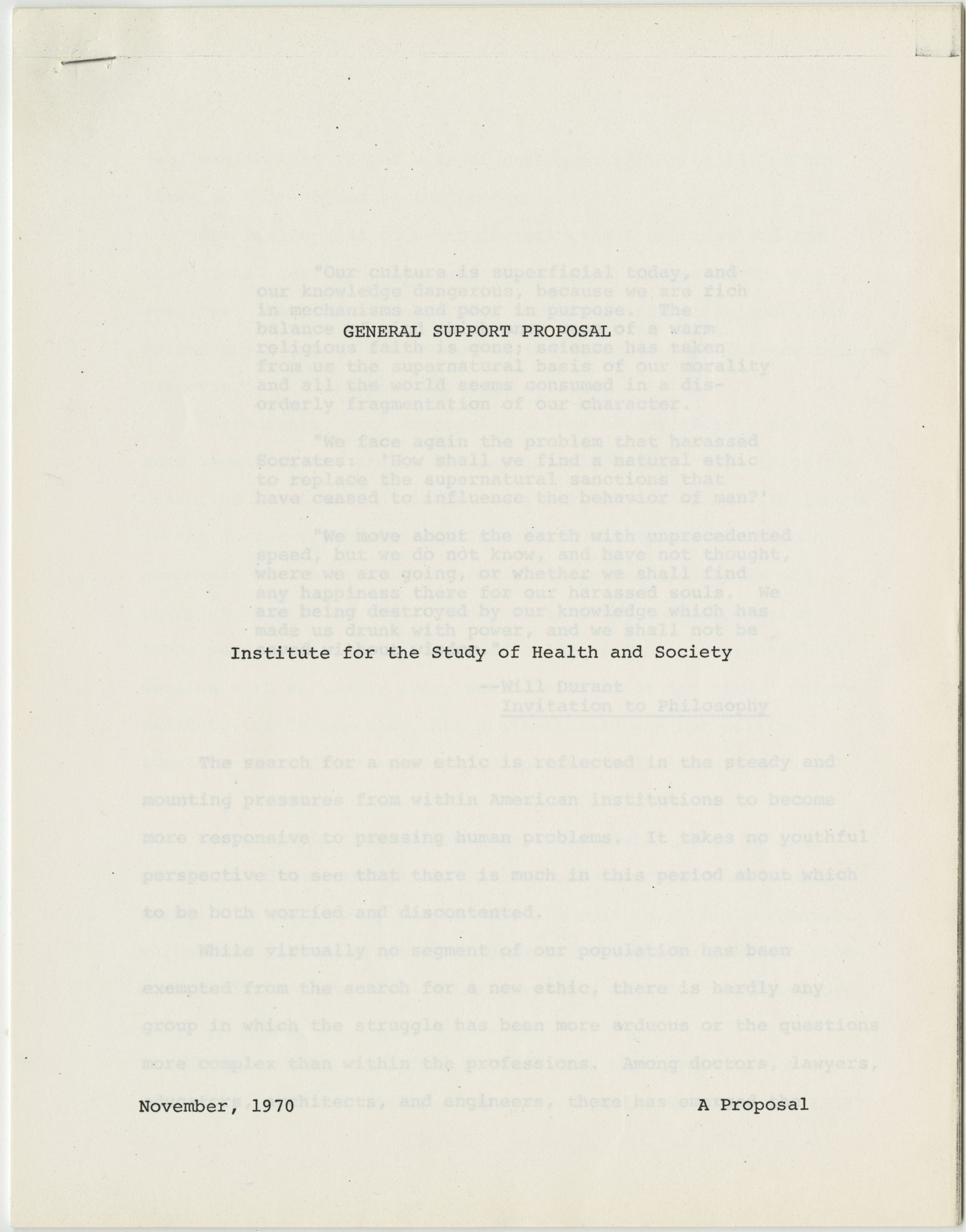 With the aim to secure three years of funding, this proposal highlighted the accomplishments of the Institute for the Study of Health and Society (ISHS).