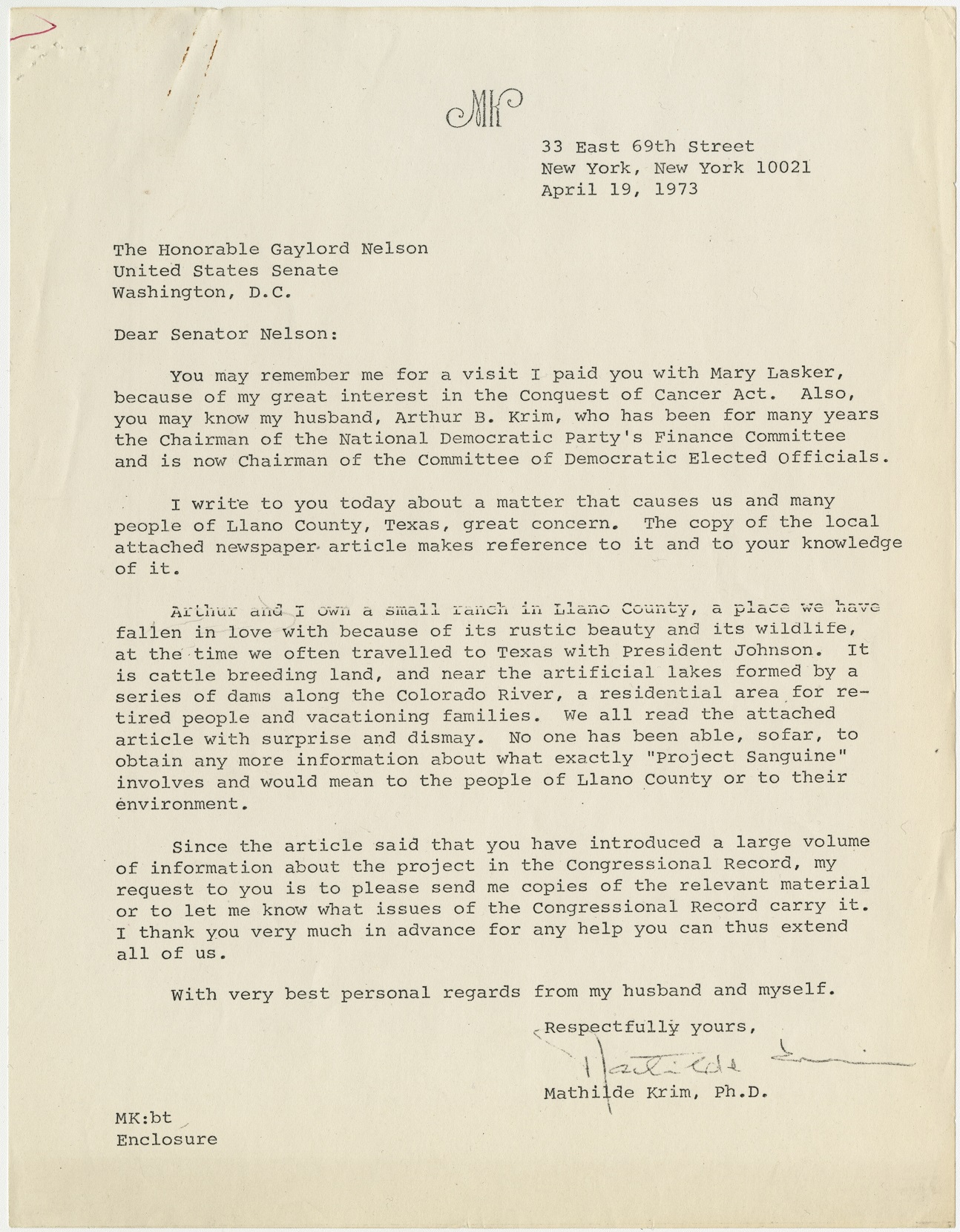Letters between Mathilde Krim and Senator Gaylord Nelson regarding Sanguine transmitter