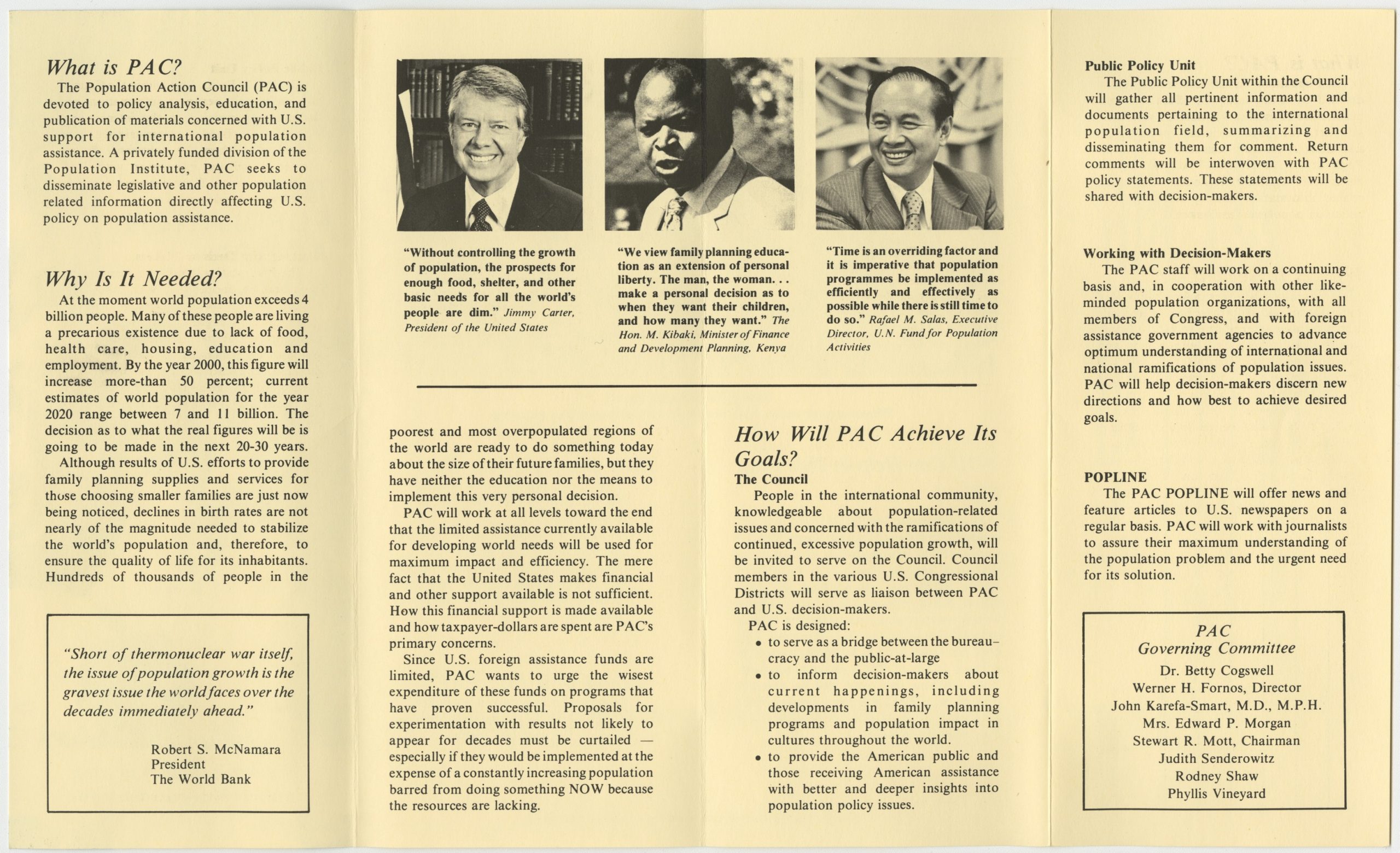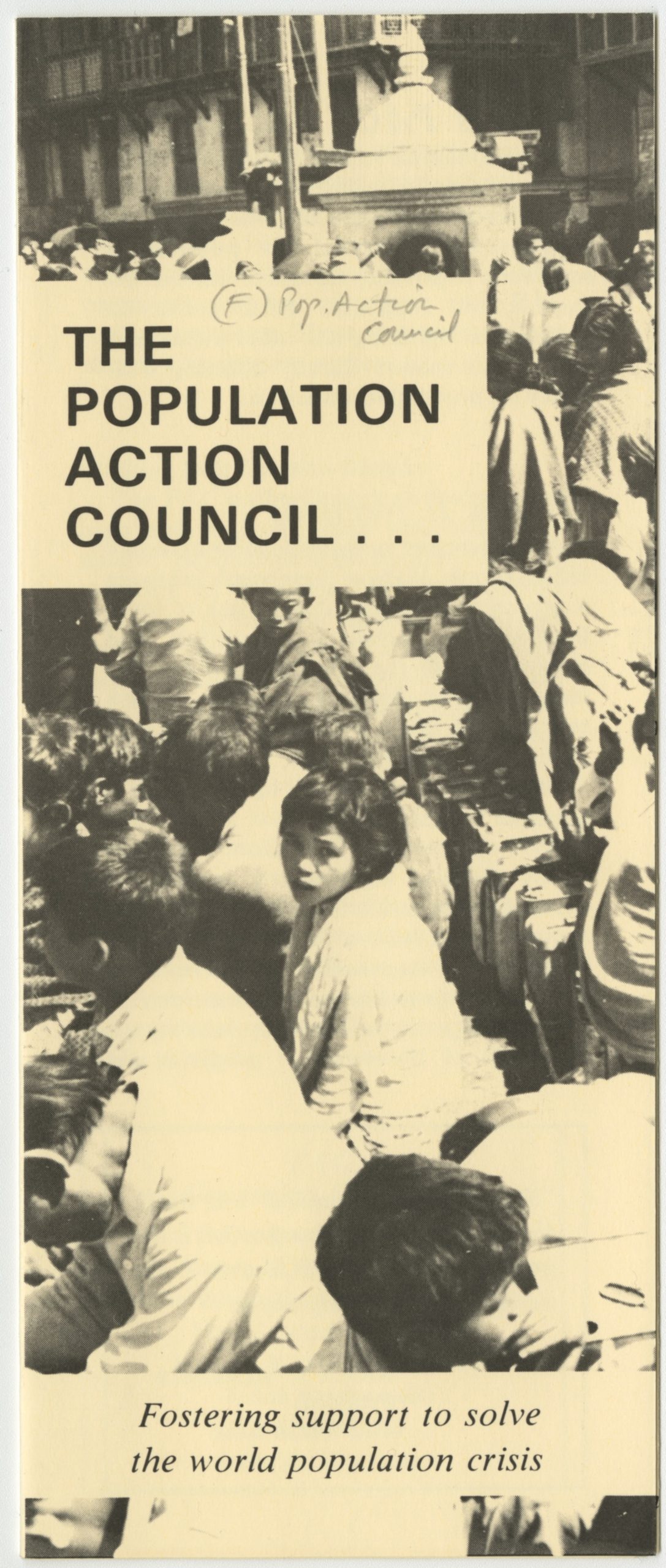 The Population Action Council extended the mission of the Population Institute (est. 1969) to support family planning and reproductive healthcare internationally. At the time of this brochure, world population was projected to reach 7 to 11 billion by 2020. World population has doubled since the first Earth Day, reaching 7.7 billion in 2019.