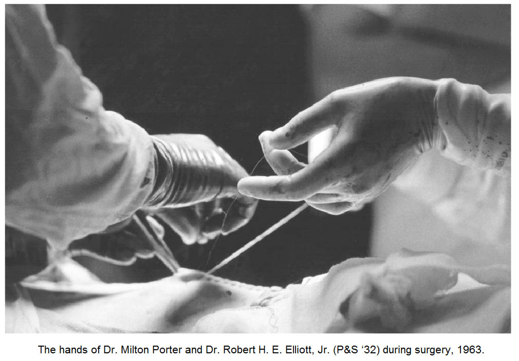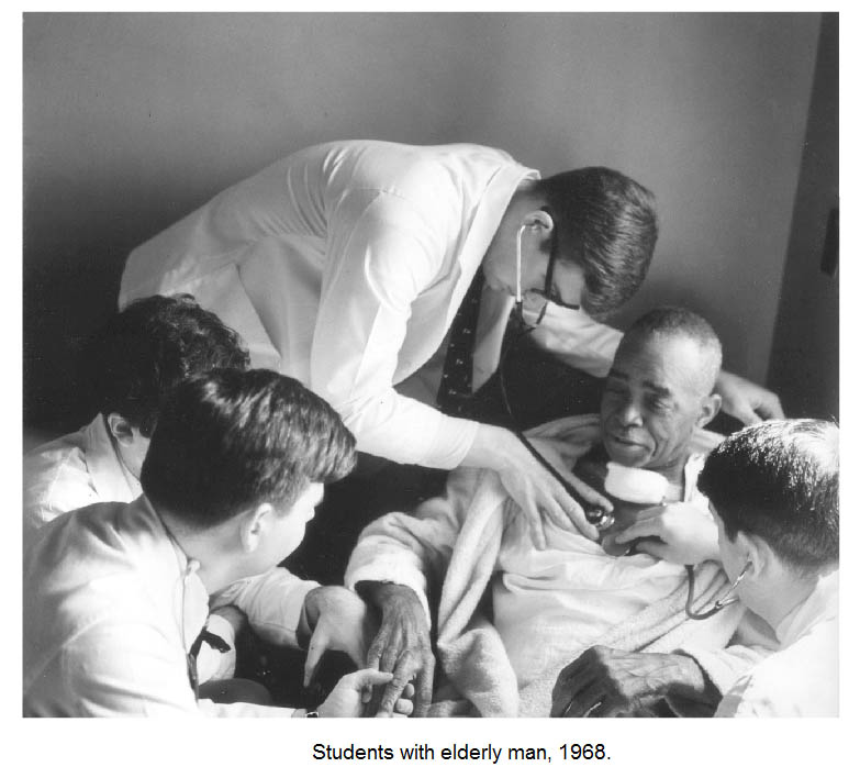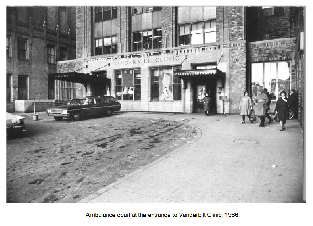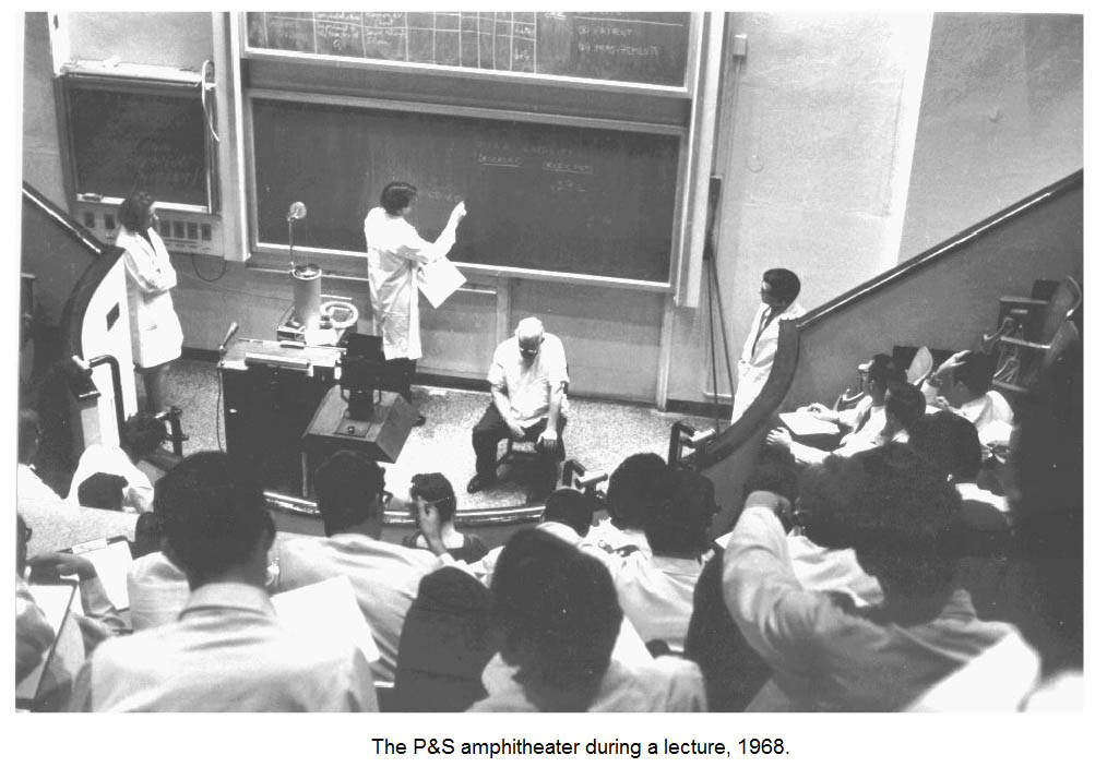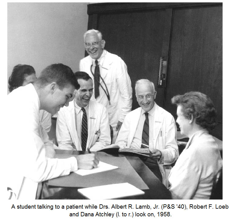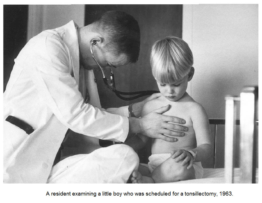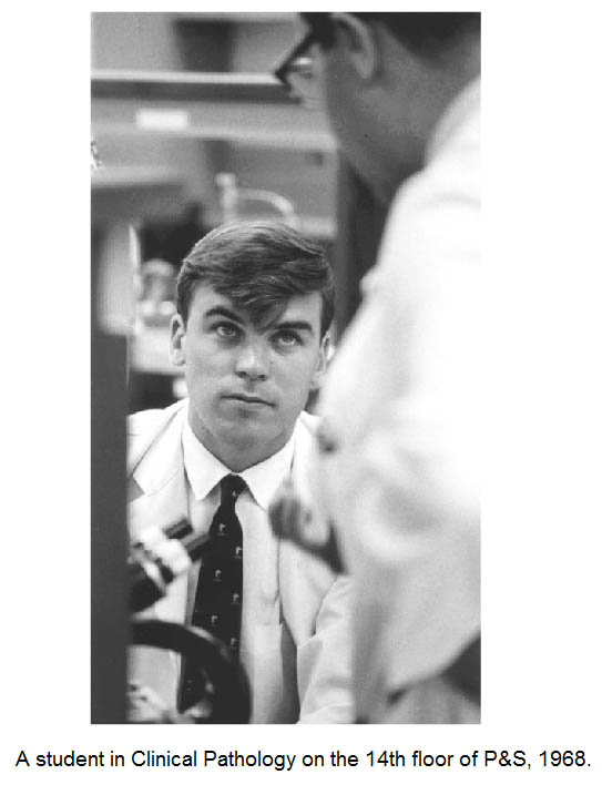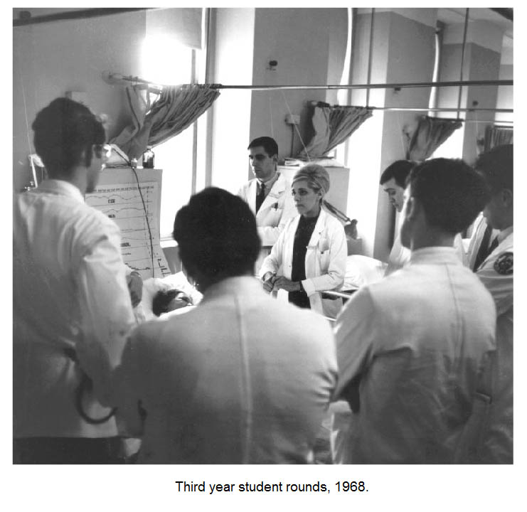 It is not often that an institution has the good fortune to hold a pictorial record of its history in the depth that the Wilcox Collection documents the Columbia-Presbyterian Medical Center. Fortunately for us, Libby has been around medicine all her life. Her broad perspective on the world of medicine was initiated by her father, who was a physician. It was expanded by her marriage to Herbert “Bud” Wilcox, P&S alumnus, Class of 1934, and a former faculty member of P&S. This intimate connection to the field allowed Libby to forge a union between personal knowledge and professional talent, and to approach the Medical Center from a variety of viewpoints. Her diversity is represented in a body of work that is exhaustive. Images of doctors, nurses, patients, faculty, researchers, and students are captured in her photographic memory on streets, in buildings, classrooms, clinics, offices, operating rooms, and sometimes on social occasions. She even drove to campus during the great “Blackout” of 1965 to record how the hospital coped during the hours of crisis. Earlier, she traveled to Liberia with Columbia medical students who were taking an elective in tropical medicine. Included in this series is a photograph of the moving moment when a young woman is diagnosed with small pox.